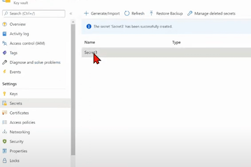 To create Secrets in Azure Key Vault, Goto Settings-> Goto Secrets. Click on Generate /Import